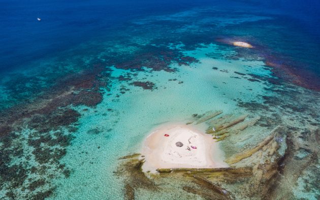Further south, the long, wild island of Isle à Quatre cradles a lagoon on its southern side. There’s not much colour in the vegetation, a dry, mossy bush; a blend of green and grey. But the colour lost in the land is made up in the water. The lagoon consists of a luscious palette of blues, bottomless cobalt in the deep channel, giving way to the shallower patches of turquoise and the almost teal sections of the reef.