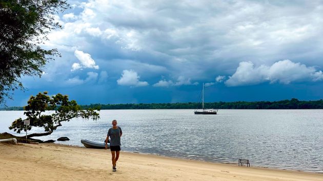 This far upriver, the tidal effects are lessened, but we quickly learned that giant afternoon thunderstorms pass over the river almost daily, gusting enough to move us around significantly. Fortunately, as the only yacht in the country, we had plenty of swing room.