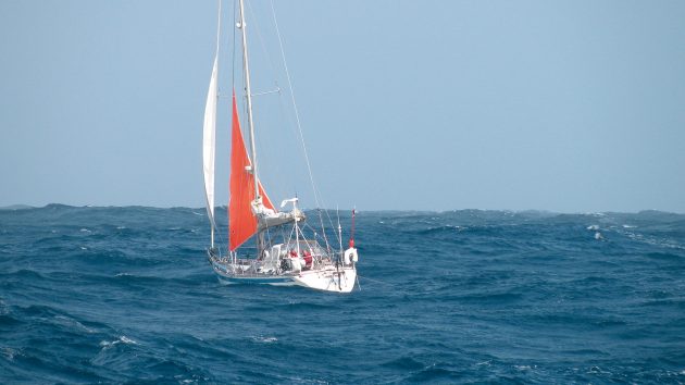 When properly hove-to, your world changes: the boat locks in at a steady angle of heel and bobs on the seas while the crew gets needed rest. We find we use this tactic more than any other. It’s easy and effective. But at some point it can become dangerous…