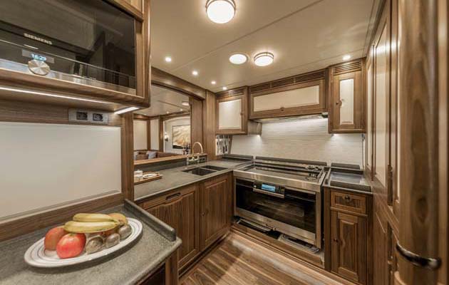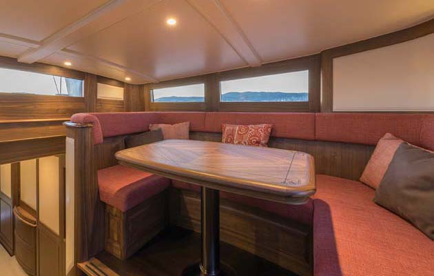 A traditional skylight floods the saloon in natural light. A sliding hatch in the bulkhead between the saloon and the galley further forward helps open out this space and allows the owner to incorporate the compact galley into his living space. It’s a clever arrangement that also keeps the teak-finished crew area forward private.
