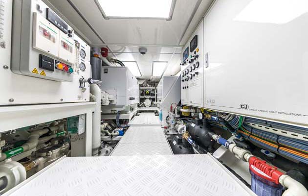 The engine room, accessed from the passageway opposite the compact navstation or via the saloon sole, is particularly well laid out offering easy access to all the systems.