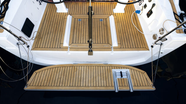 Overall draught is 2.2m, while the very high aspect rudder is 1.9m deep. This gives a reassuring amount of grip even when the boat is pressed on a reach. At the same time, it offers less drag than twin rudders in light airs and you have the benefit of the prop wash over the central rudder when manoeuvring in tight spaces. A downside of the deep rudder is vulnerability to grounding.
