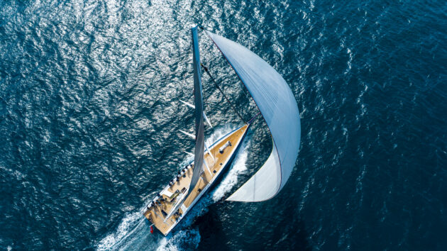 The result is a sail plan that towers 46m above the waterline and sits well back in the boat. This achieves a long foot length (J measurement) for the biggest headsail, and provides scope for a range of furling headsail systems.