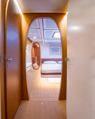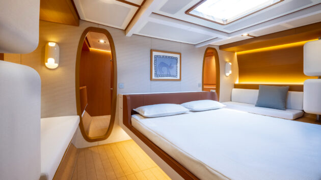 “The big challenge was that we had a weight budget of just two tonnes for the entire accommodation,” said designer Axel de Beaufort. “We worked really hard to keep the weight down and used some of the natural features of the boat to accentuate the unique feel below decks.”