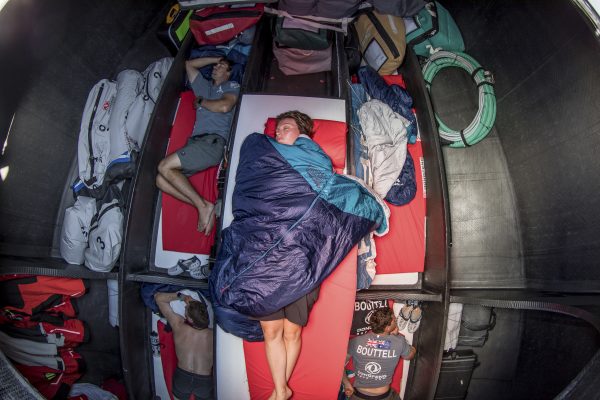 Later I meet him in the team container as he packs food for the leg ahead. Each sailor’s rations are individually calculated. He lays out a full day’s menu – freeze dried meals, protein smoothies, nut bars (700 calories a pop and the closest the sailors get to a treat, no blood sugar-spiking chocolate bars), supplements and snacks like beef jerky.