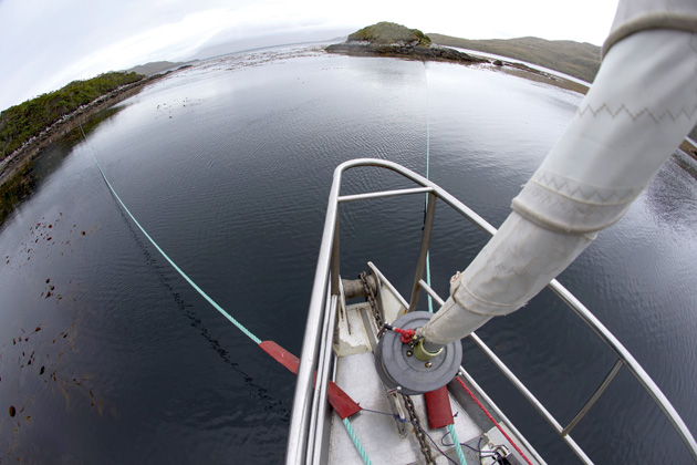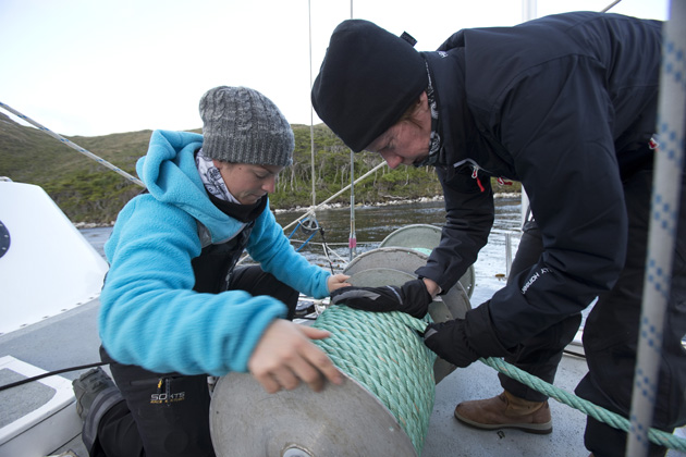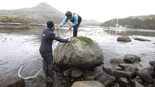 Attaching to the shore requires strops. We use long loops (4m) of galvanised wire, bulldog-gripped together. Some use a long wire with a thimble eye in each end, which has the advantage of threading through a keyhole. Galvanised wire is supple, easy to handle and doesn’t break strands easily like stainless steel, which will quickly ‘meat hook’ and be impossible to handle without heavy leather gloves. After ten years of tying to shore on Pelagic Australis we are using the same galvanised wire loops.