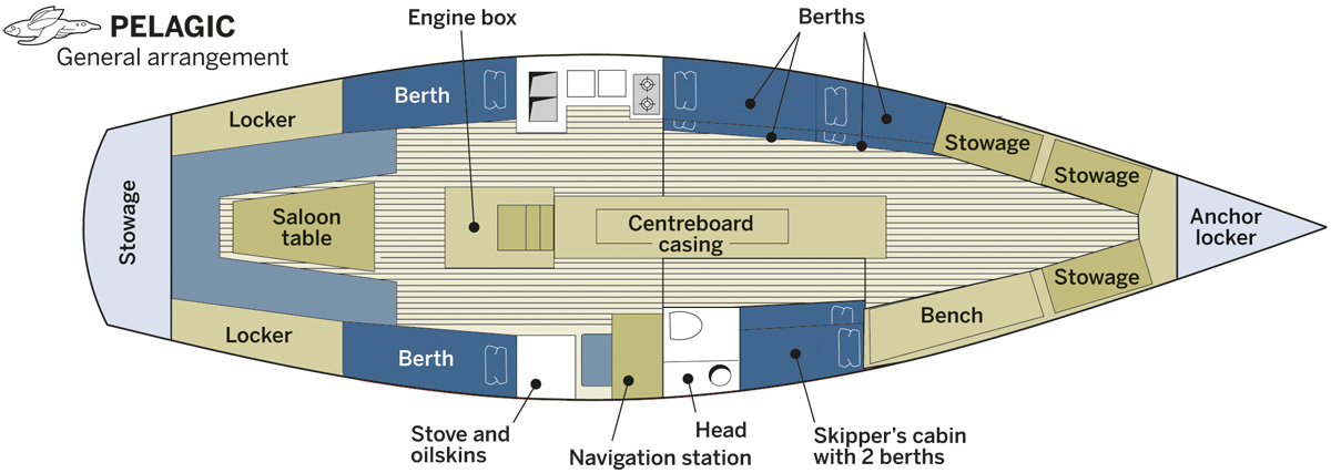 The fundamentals of Pelagic are her steel construction, a swing, lifting-ballast keel, swing rudder and a cutter rig. The inspiration was a string of French boats of the 1980s with swing keels, but with an unbalanced fixed rudder on a full skeg.
