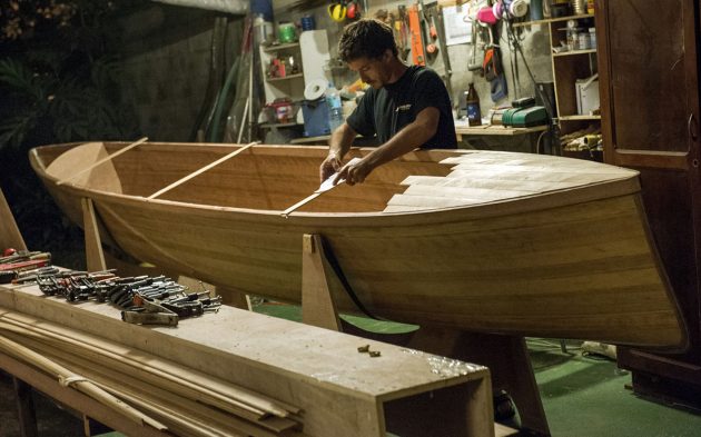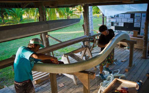 The build created the opportunity to train two young people from Fakarava, and one of these young men, Toko, hung in right to the end of the construction. He proved to be an excellent laminator as well as disconcertingly natural at sailing the 30ft canoe, which is not an easy machine for a beginner to handle. The Paumotu people have an incredible ease with the water.